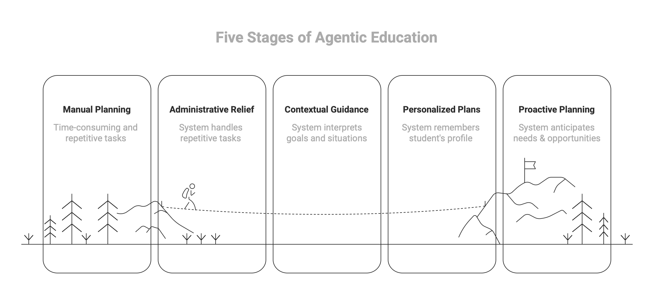 Like many things in AI, agentic education is sometimes overhyped too early. People imagine fully autonomous systems that can educate a child from beginning to end without human guidance. That vision may be far off, and in many cases, it is neither realistic nor desirable. It is more useful to think of agentic education as developing in stages. And for school owners, these stages offer a very practical glimpse into how the parent and student decision journey will evolve.